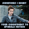 Description: Edward Cullen poses by his car. Text says "Sometimes I doubt your commitment to sparkle motion"