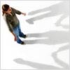 Description: A woman is out in the snow with her arms slightly away from her body. Looking down there r three shadows holding hands.