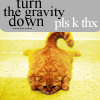 Description: fat cat lying flat on the carpet with text that says "turn the gravity down, please k thanks"