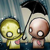 Description: cartoon ppl in the rain, one is holding an umbrella over the other.